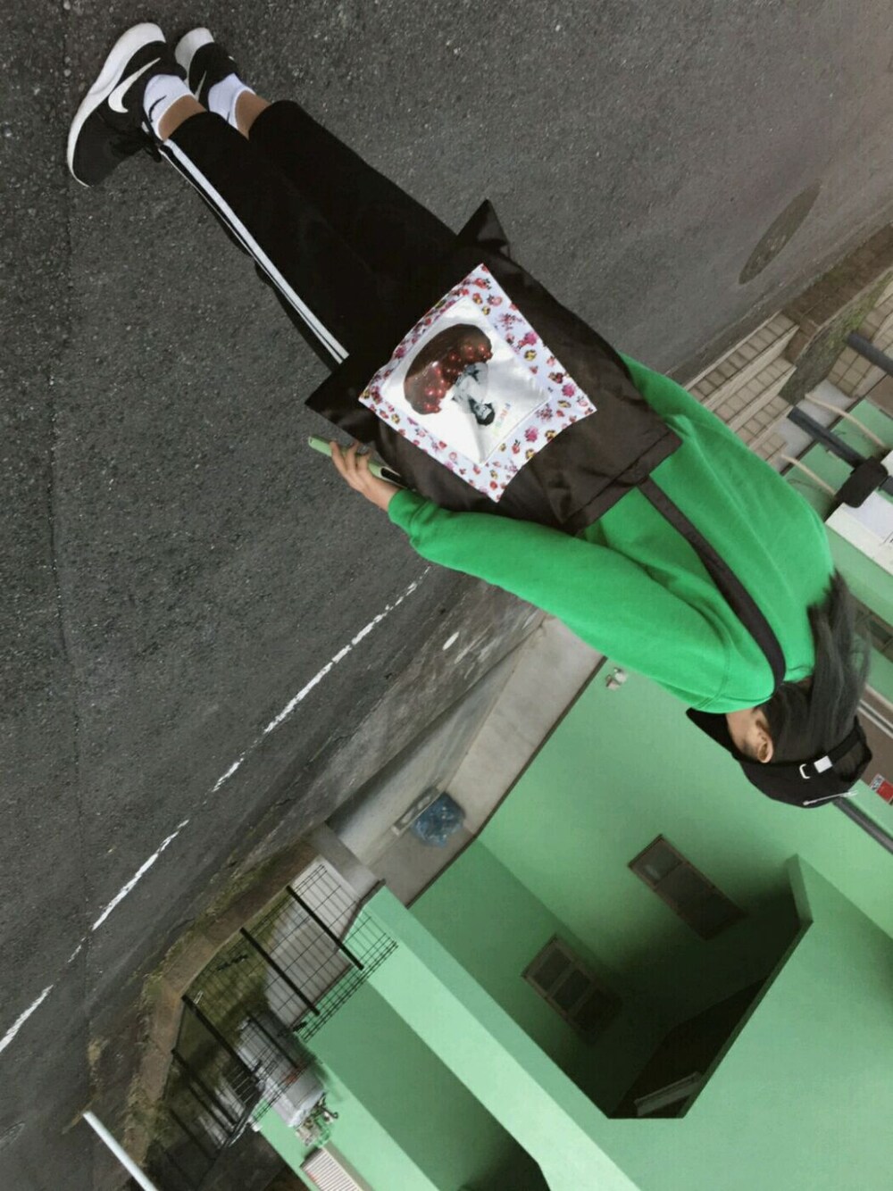 ベースはブラックで靴で身長が盛れなくてもキャップとスウェットの大好きなグリーンで目線は上に ! コリアン意識🌵