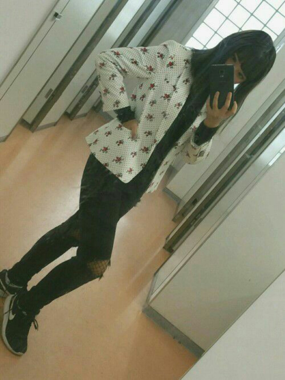 モノトーンに栄える白のジャケットの薔薇🌹 下にはタートルのセーターをきてZARAでかったパンツのダメージを広げて下に網タイツを履いてチラ見せワンポイントでジャケットでも決まりすぎないズレ感を💯