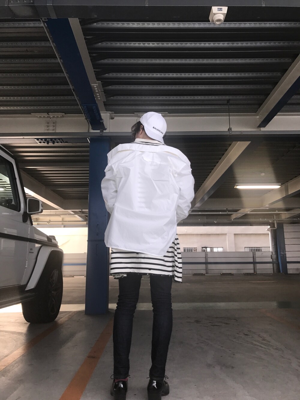 この日は緩くシックに バレンシアガのスウィングシャツ、レディースだけどいい感じ、キャップと白で合わせた