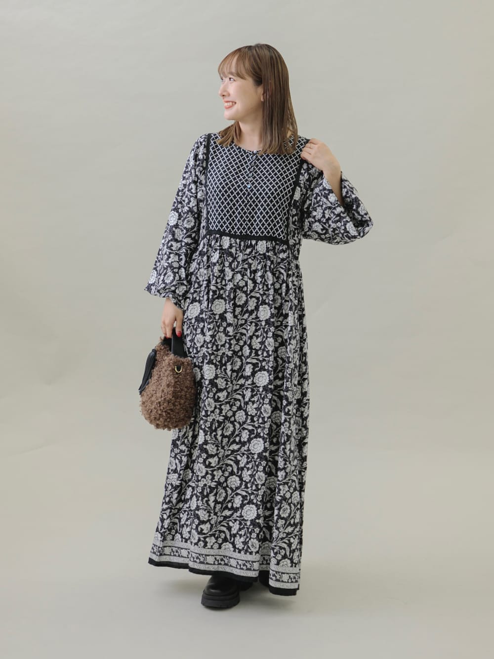 身長:156cm/骨格:ストレート/パーソナルカラー:イエベ春 ぱっと着映えする柄ワンピース👗 アウターとのバランスも良いので 長い期間着られます◎