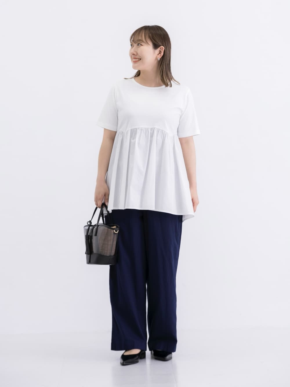 身長:156cm/骨格:ストレート/パーソナルカラー:イエベ春 胸下から布帛に切り替えているカットソーは ブラウス感覚で着られます◎ 156cmだとお尻がしっかり隠れるくらい 結構長めの着丈なので、細身パンツ合わせが良さそうです!