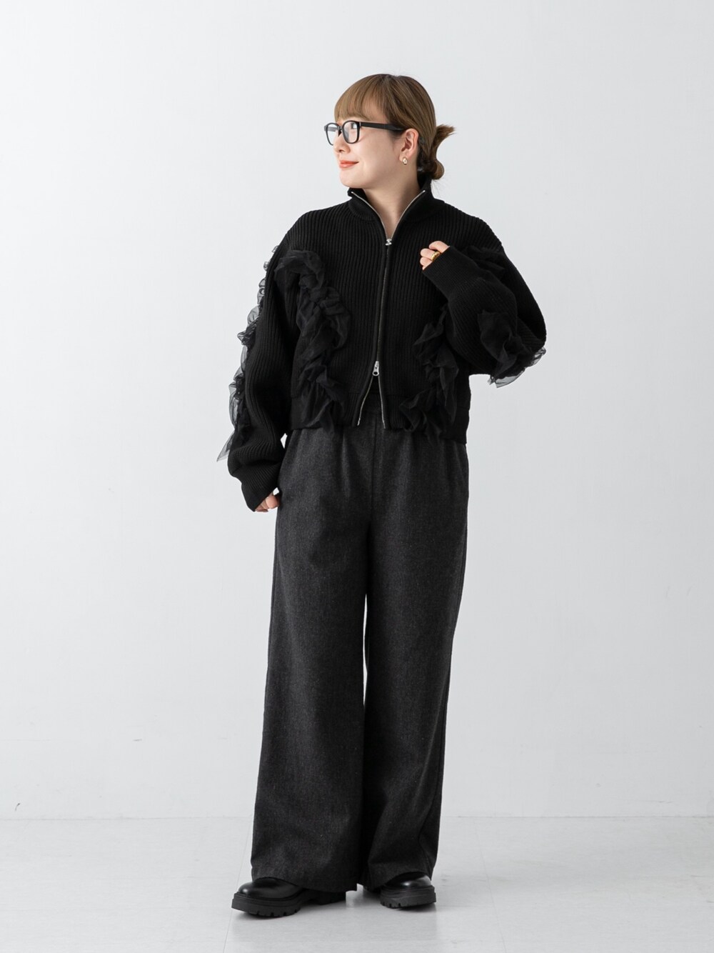 身長:156cm/骨格:ストレート/パーソナルカラー:イエベ春 WEB限定のニットブルゾンは ひらひらとしたチュールがとっても着映えする一着! 素材感としては通年着られるような軽めの糸なので 今から春までお使いいただけます! 今回は幼く見えないように、モノトーンでまとめてみました。 黒は一番甘さも抑えめで挑戦しやすいです◎ どこから見ても着映えするので、 テーマパークに行く時やコンサートなどにも ぴったりだと感じました(*^_^*) ボトムは大人気のツイードパンツ! ウエストゴムなのでとっても楽に着られますよー♪