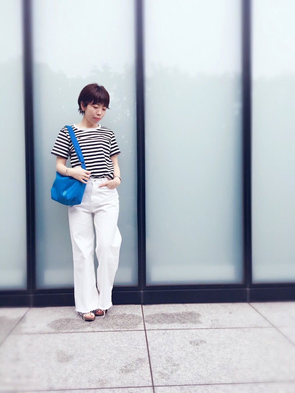 ボーダーとホワイトデニムに鮮やかブルーのショルダーバックでシンプルな夏コーデ☀️