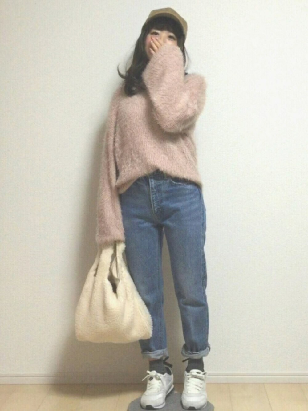 とってもシンプルなコーデ🙆🏼 トレンドカラー2016AWに参加します🙌 ピンクのニットはブラ袖💕 ニットが可愛すぎるので デニムとスニーカーでボーイッシュ👦に✨