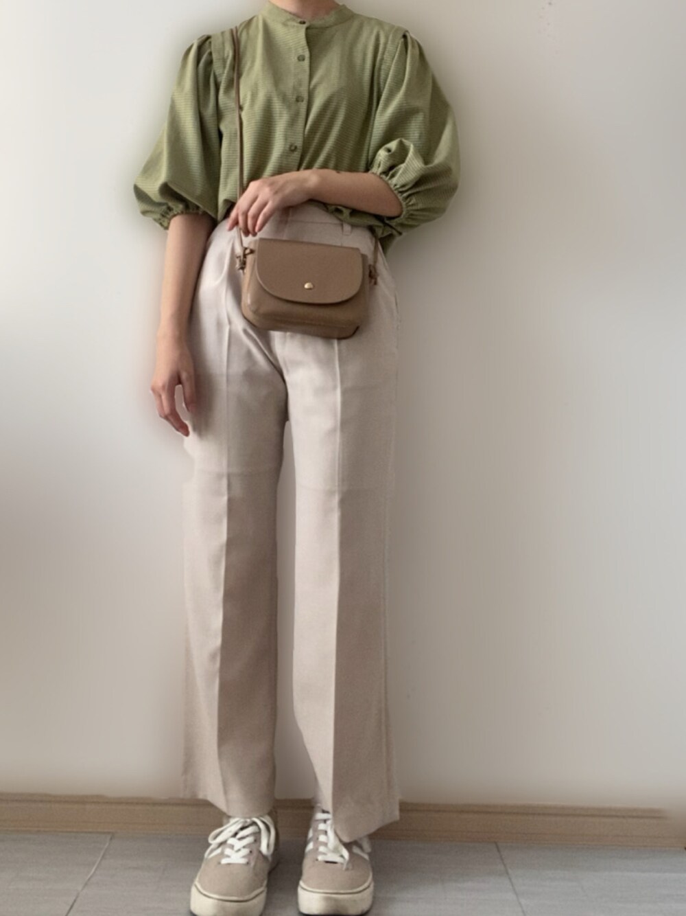 春っぽい雰囲気ですが、グリーンのトップスが可愛すぎる💚 袖がゴムでクシュっとなっているので、気温によって袖の長さが変えられるのがポイントです💚🍏