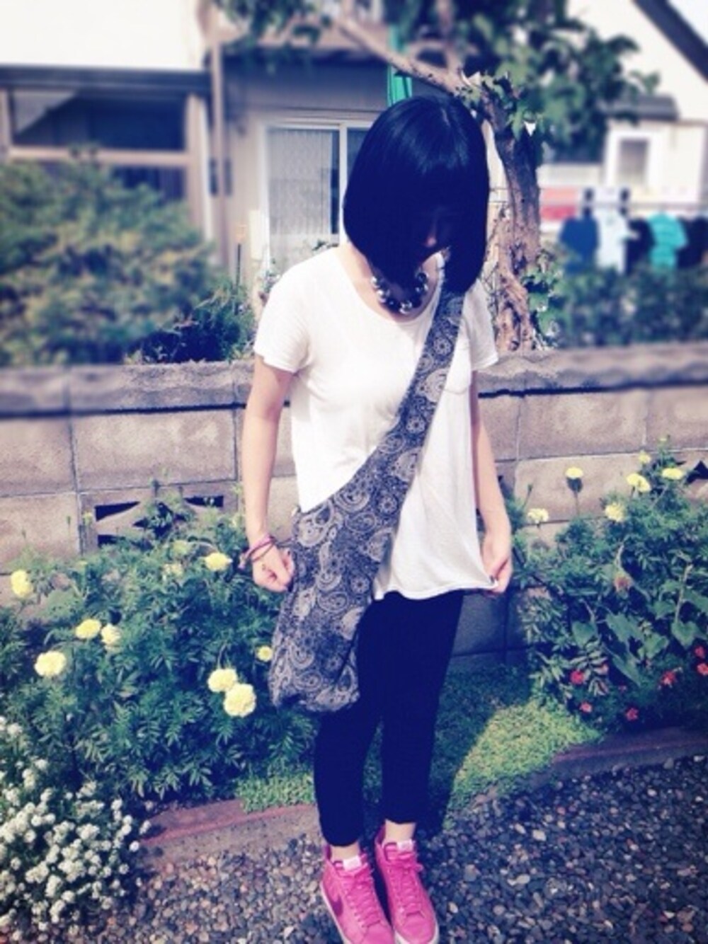 bag #ブランド不明 お婆ちゃん家の前で。 近所の生協で500円のバッグ👜 タイの生地なんだって。