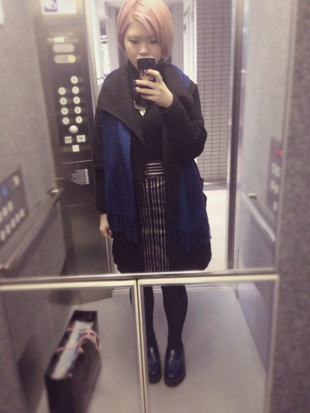 Day:4 Dec. 2014 マフラー、リュック、ローファーを青で統一、 黒青メインのコーデ コートは700円で買った古着ですが 他のものと併用しつつ愛用して2年近く経ちます ローファーはどうしてもフリンジ付きの厚底が欲しくて、探しました… 派手髪でこんな格好する人っているのかな