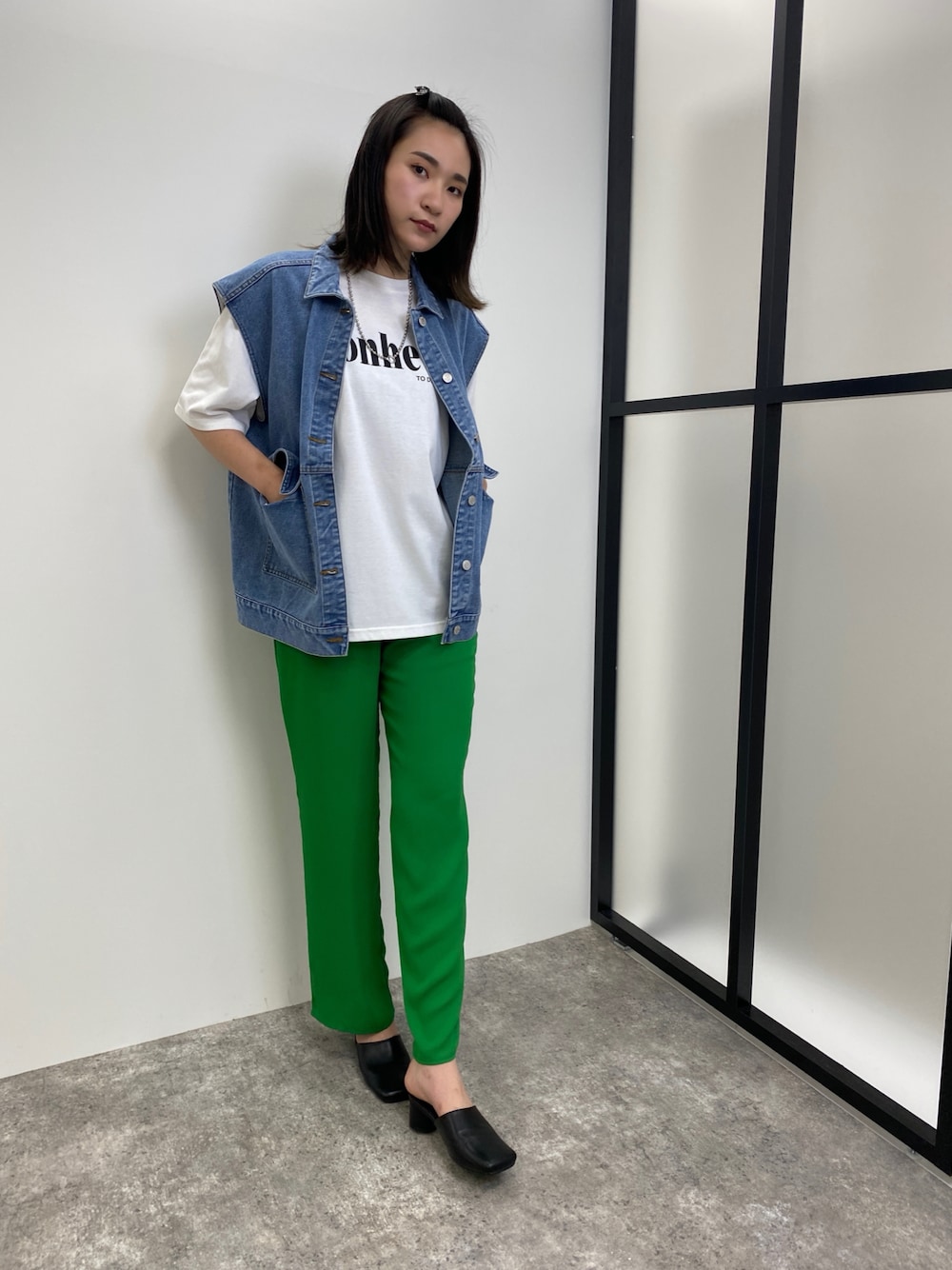 春のアウトドアにおすすめ!デニムベストコーデ。 カラーパンツを取り入れることによってコーデをまとめられ華やかな雰囲気に◎