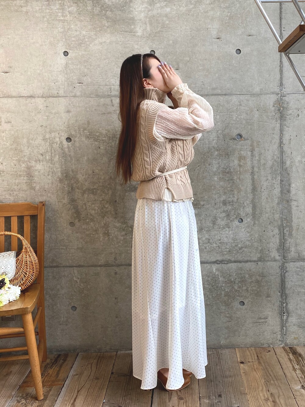 やっぱりまだベスト着たい🙆♀️🙆♀️ シースルーブラウスに合わせてみました☺️ スカートは新作のドットスカート😉 細ベルトするだけで印象変わります💕 是非チェックしてみてね🥰