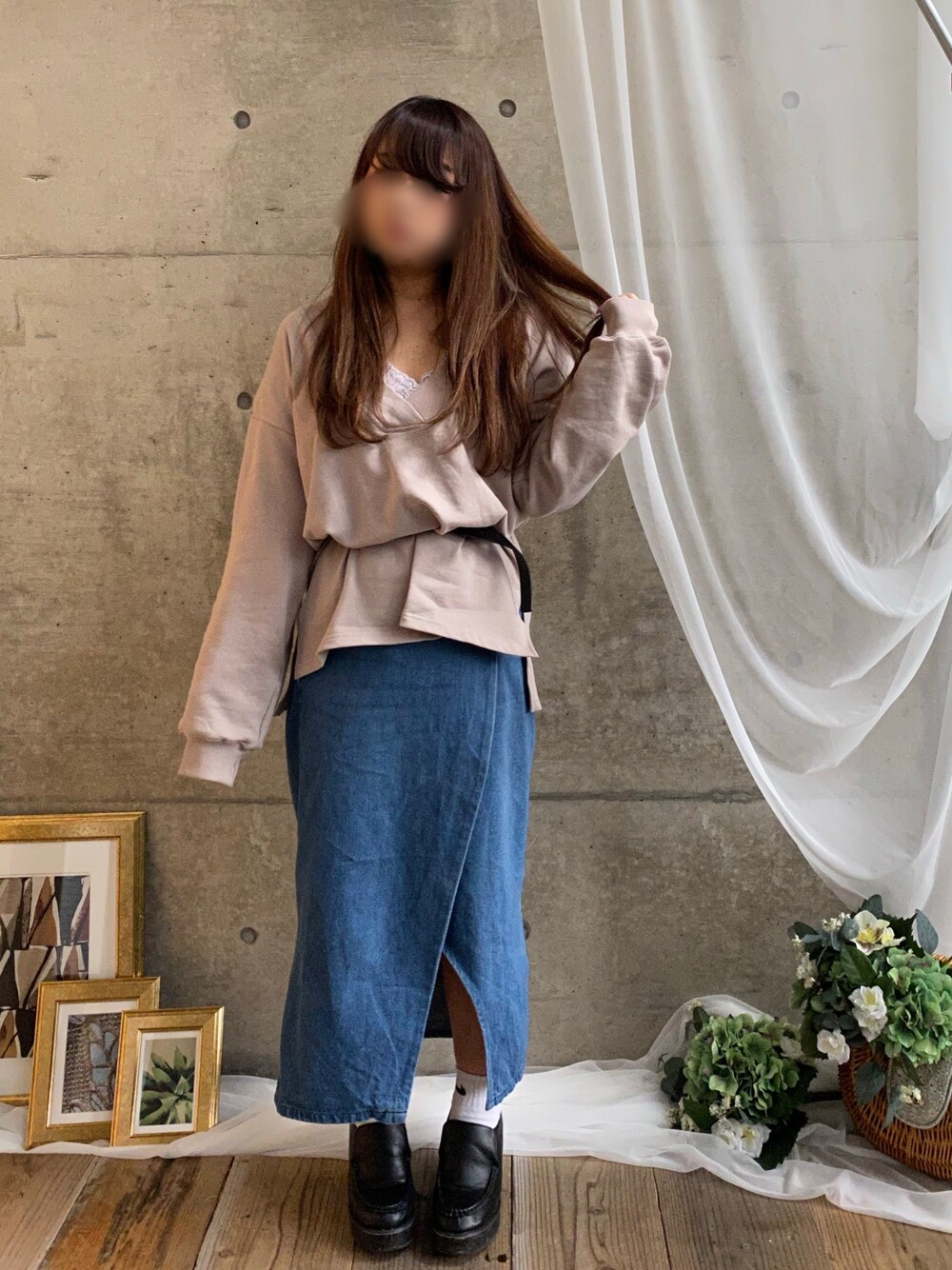* 𝙠𝙧𝙣 *のスウェット「深Vネックプルオーバー」を使ったコーディネート