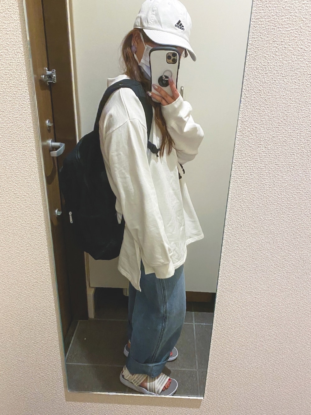 今日は会社に行かなきゃなんでリアル今日コーデ😭 誰にも会わないし〜って思ったら超絶ラフになりました🙄 キャップもリュックもサンダルもadidasだった、、 adidas星人😭
