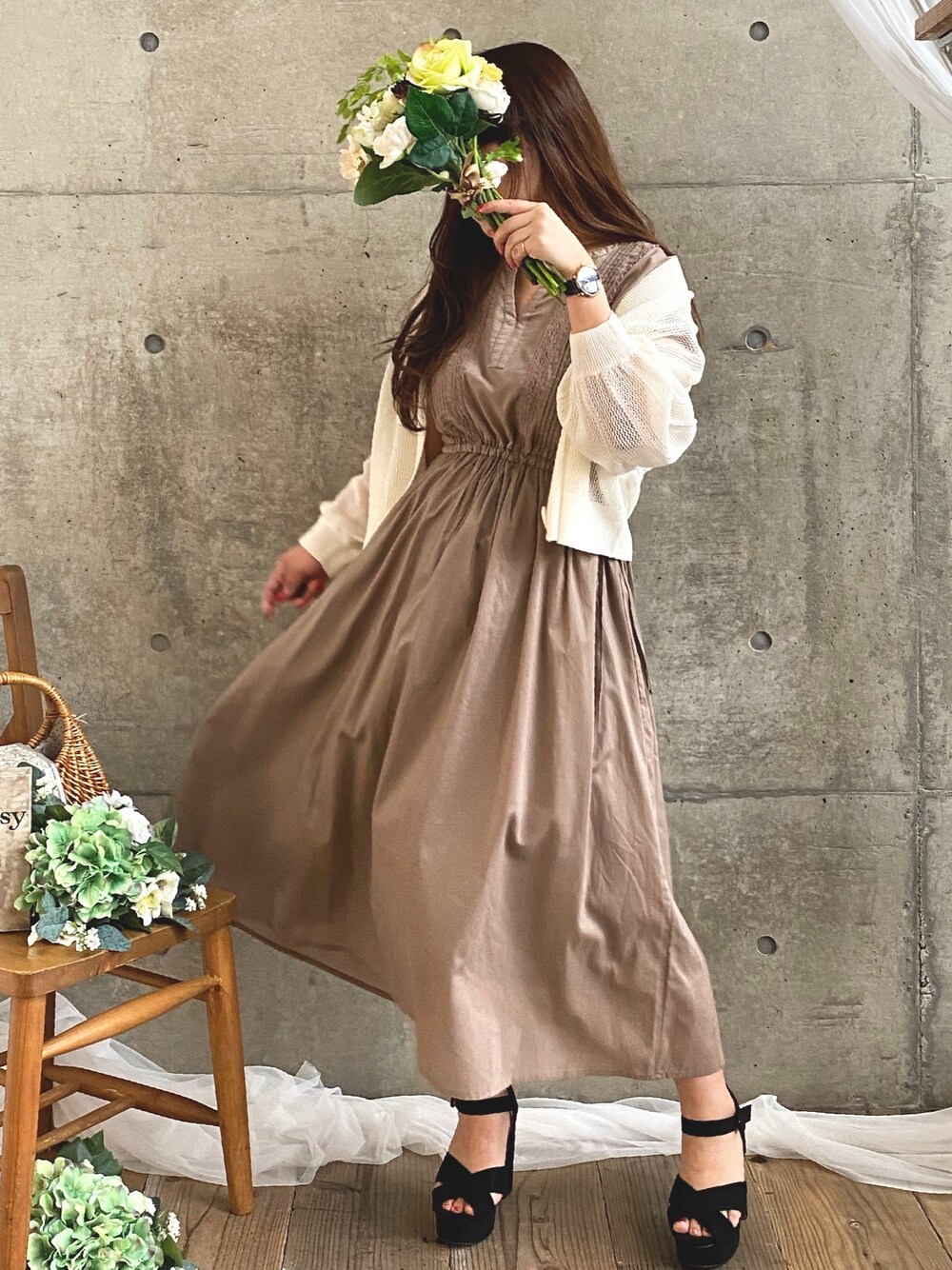 このワンピース抜群に着やすいな🙄 ウエストのドロストも自分で調節できるし🥰✨ 透かしカーデも丈感すごーくちょうど良いと思いません🤔❓ 色合いも可愛い😘❤️ 長い間着れそう🙆♀️✨