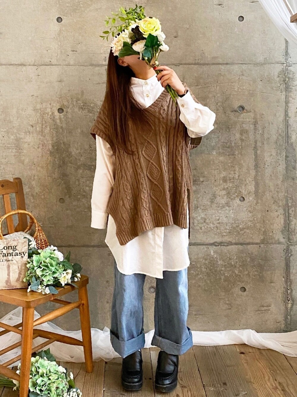 こんばんは☺️ 肌寒い日が続きますねぇ、、 衣替え終わったわたしには戸惑いが隠せない😭 シアーシャツとニットベスト合わせが可愛くて✨ ゆるだぼ是非見て下さい💕