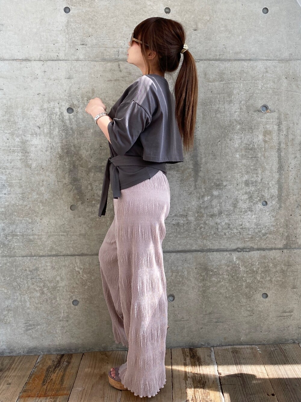 このなんとも言えないカラーが好き! バックリボンTを後ろでクロスさせて前で結ぶと、すごくウエスト細見えするよ🥺 あと足長効果✨