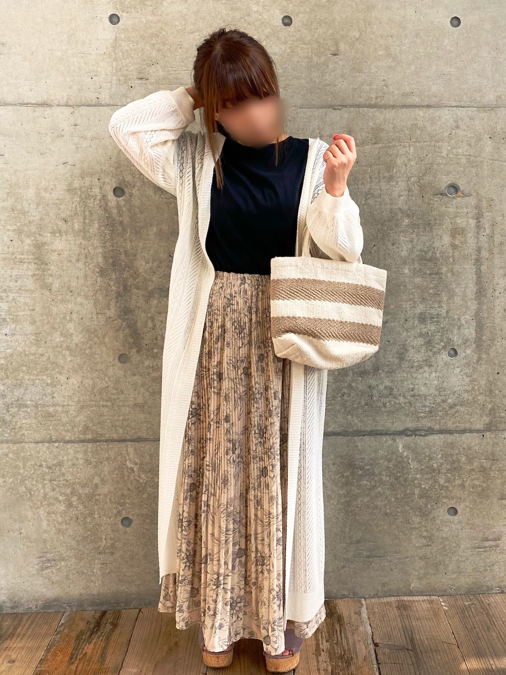 おはようございます✨ ドッキングワンピースはとてつもなく楽ちん、、😳 一枚で様になるワンピは大好きです🙆♀️✨ 人気の線画花柄スカートとトップスをくっつけました💕 細かなプリーツが可愛くておすすめ✨ わたしどこに行くにもカーディガン羽織りたい派なのでロングCD合わせました☺️🎀 リラックスできるしお出かけもできる素敵アイテム🥰