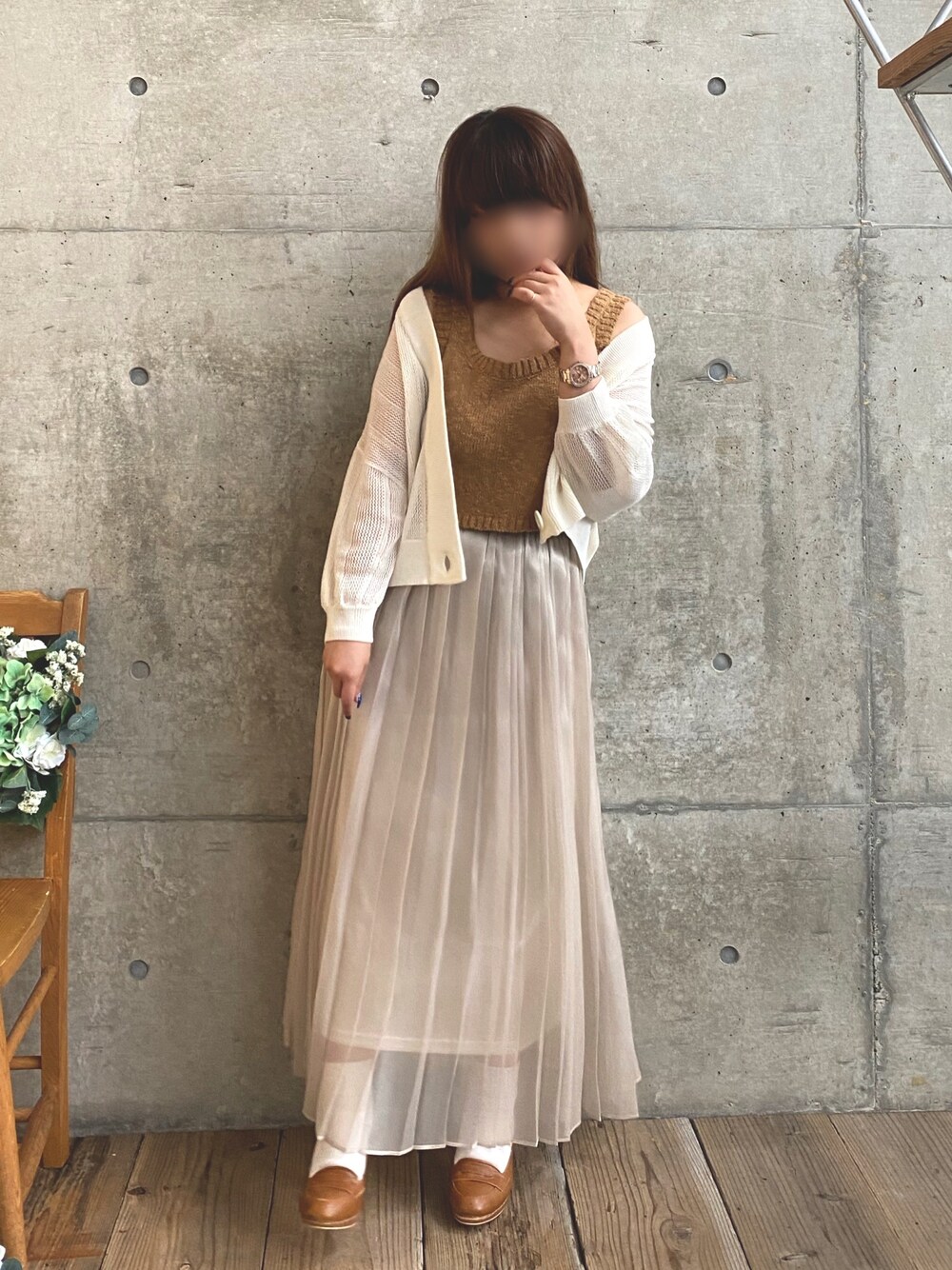おはようございます! 沢山の閲覧ありがとうございます😊 ビスチェをインナー使いにしてキレイめガーリースタイル! シアースカートと透かしカーデでエアリーに🎀 ワントーンコーデ好きです!!!