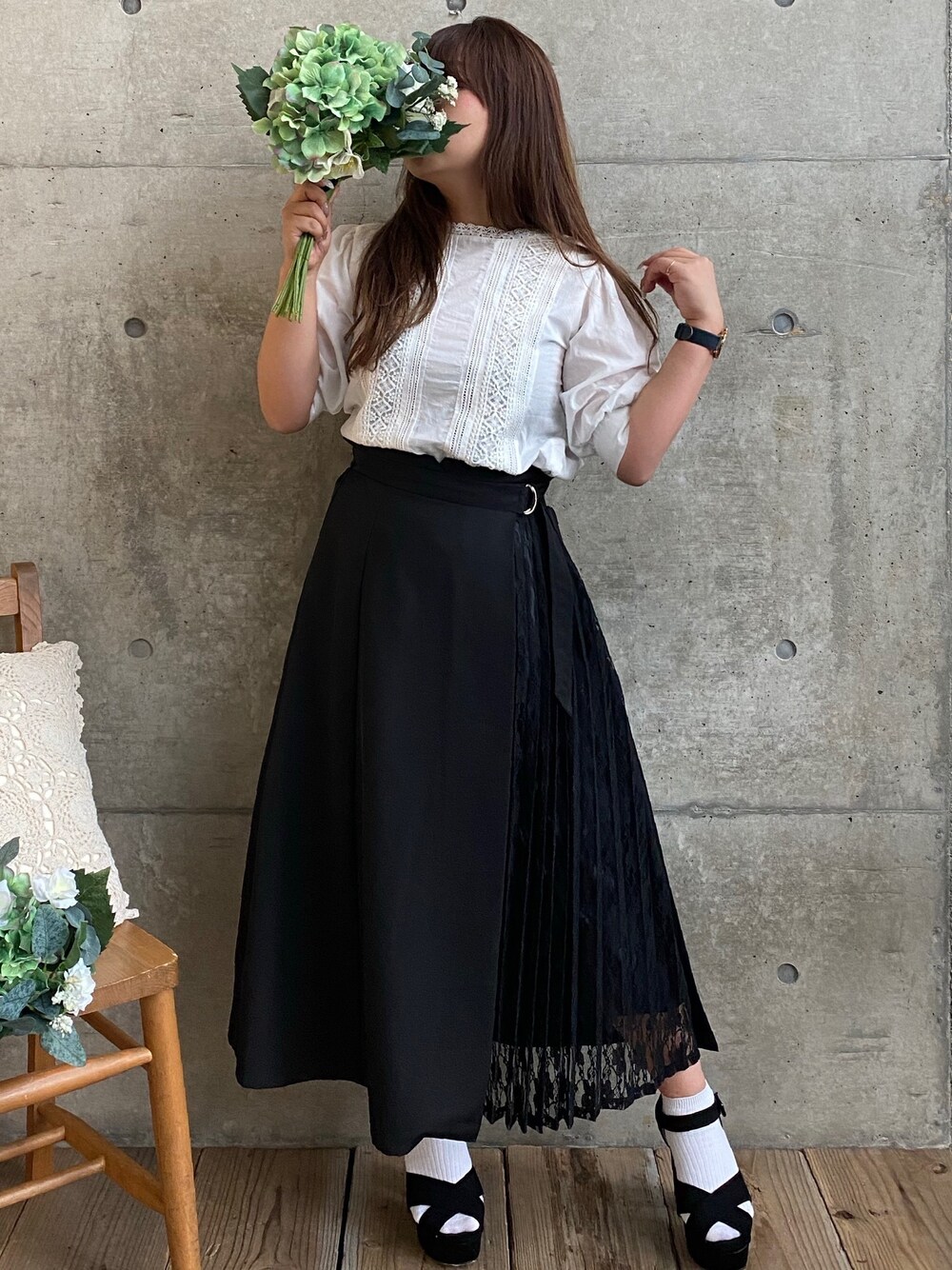 おはようございます♡ 閲覧ありがとうございます! いろんなテイストの服着れるようになって毎日楽しくなりました☺️ 今日はモノトーンだけどガーリーに♡ ピンタックコットンブラウスとポイントレースプリーツスカートの相性が抜群で可愛いのです😍 プチプラに見えない!! 素材感もしっかりしてるこだわりのアイテムです♡