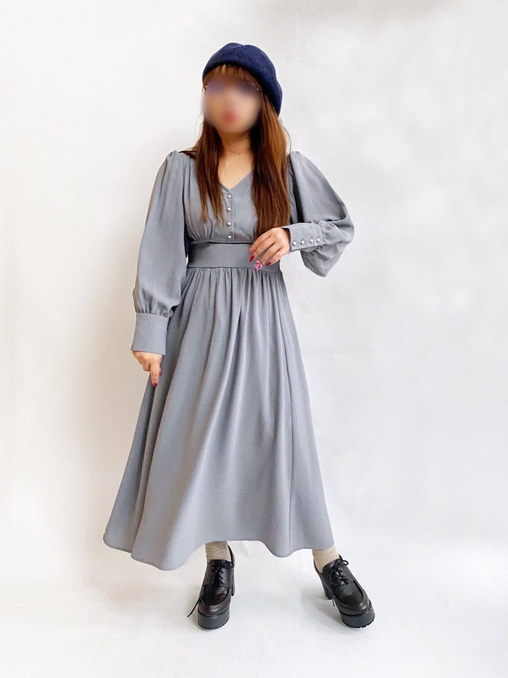こんにちは! 閲覧ありがとうございます! お気に入りも、フォルダインもとても嬉しいです! お気に入りのワンピースのご紹介! みて!袖!バフってしてて可愛く無いですか?! 長めのカフスで手首を強調してくれるので、細見えします♡ パールボタンもお気に入り! わたしはくすみブルーが最近気になって仕方ないよ😳✨