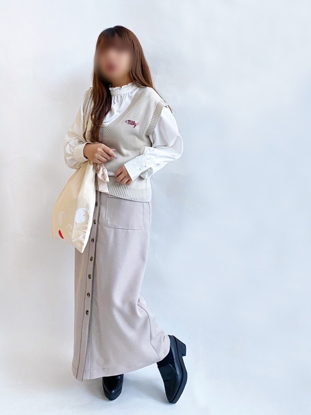* 𝙠𝙧𝙣 *のベスト「ZOZO限定!! Mysa&Liina×不二家ミルキー&ペコちゃんコラボ ニットベストトートバックSET」を使ったコーディネート