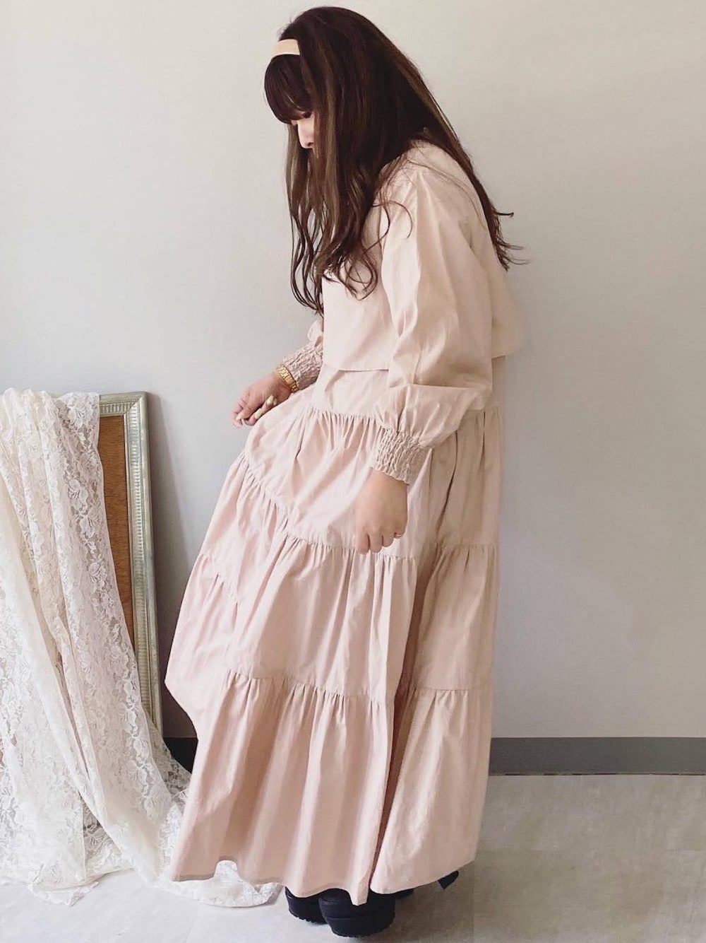 * 𝙠𝙧𝙣 *のワンピース「レイヤードシャーリングティアードワンピース」を使ったコーディネート