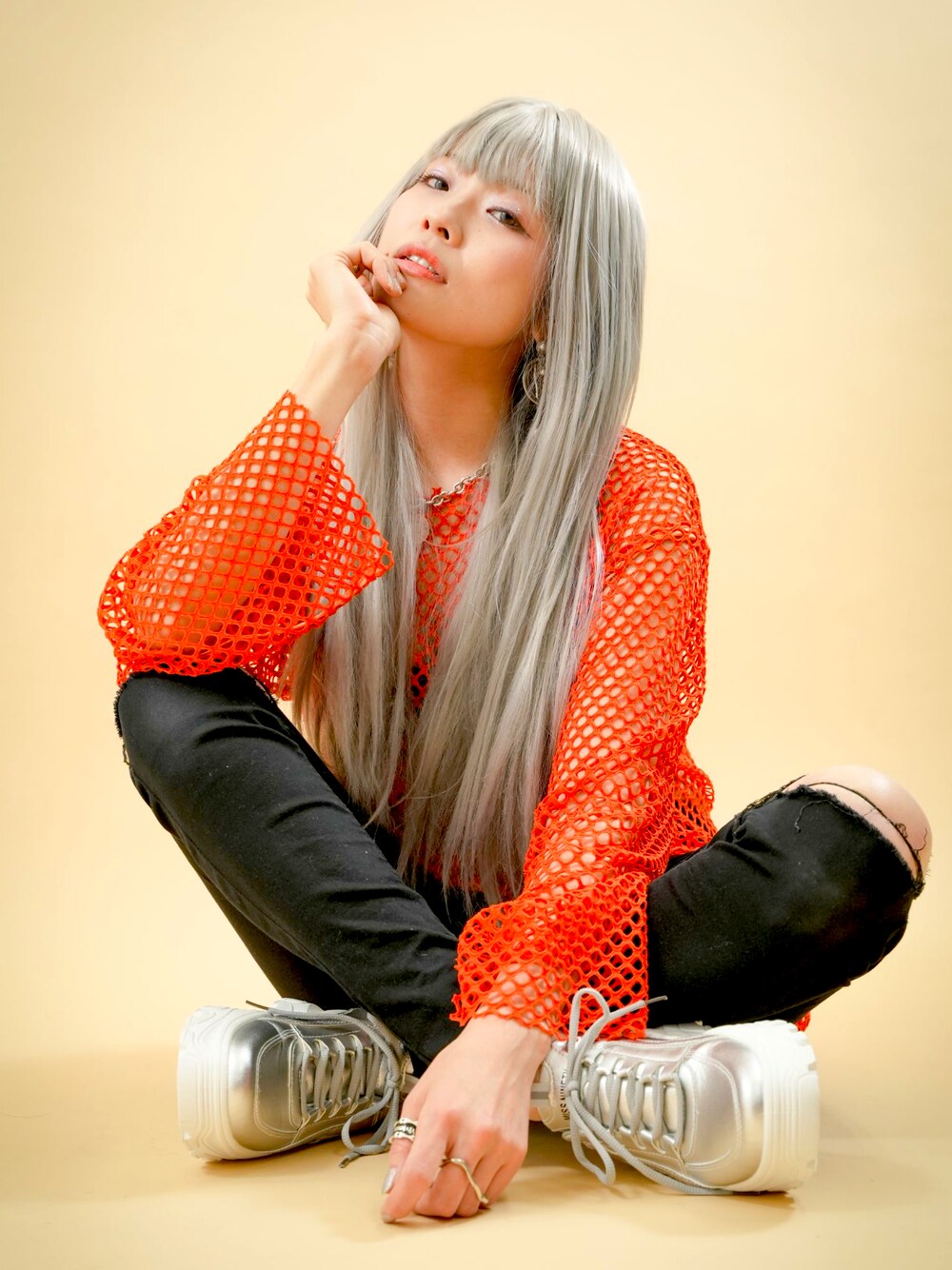 🧡✖︎🖤✖︎🤍 バキバキなオレンジ大好き◟(ˊ꒵ˋ∗)◜∗.♪🍊 ちょっとスポーティーなコーデにもハマり中😚👟 ウィッグは最近お気に入りのシルバーを被ったので、スニーカーもシルバーで統一しました👽