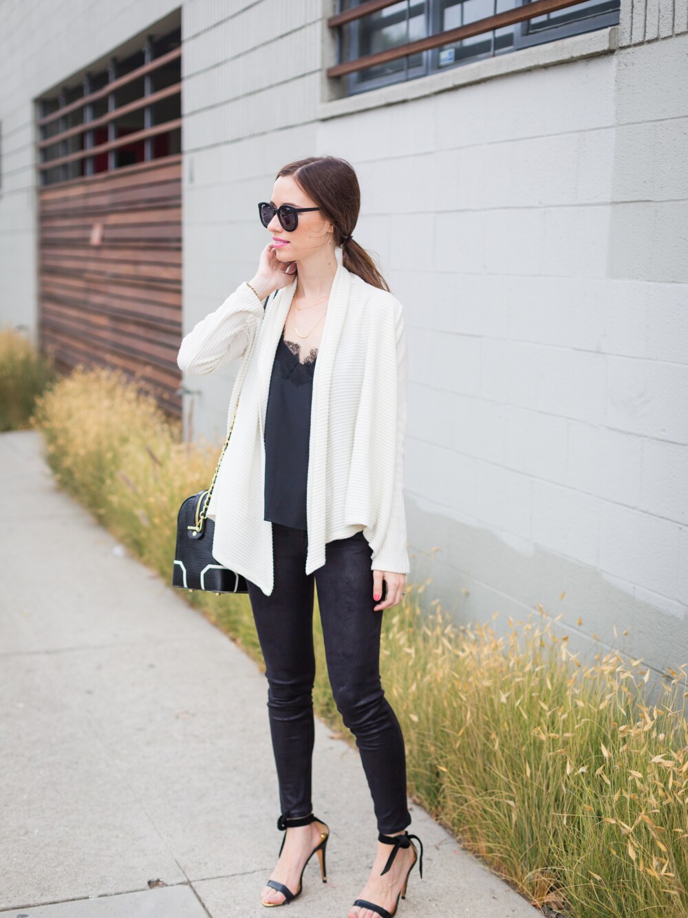 A black and white look is classic and perfect for a date night with the boy! I love these faux-leather jeans. They have a unique texture and dress up any top I pair it with. I added this lace trimmed camisole from Cami NYC and a cozy white cardigan.