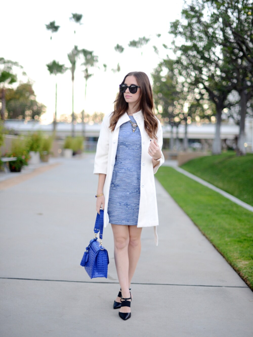 I styled one of Kenneth Cole's watches from their Transparent Collection with this blue tweed dress and a white coat.