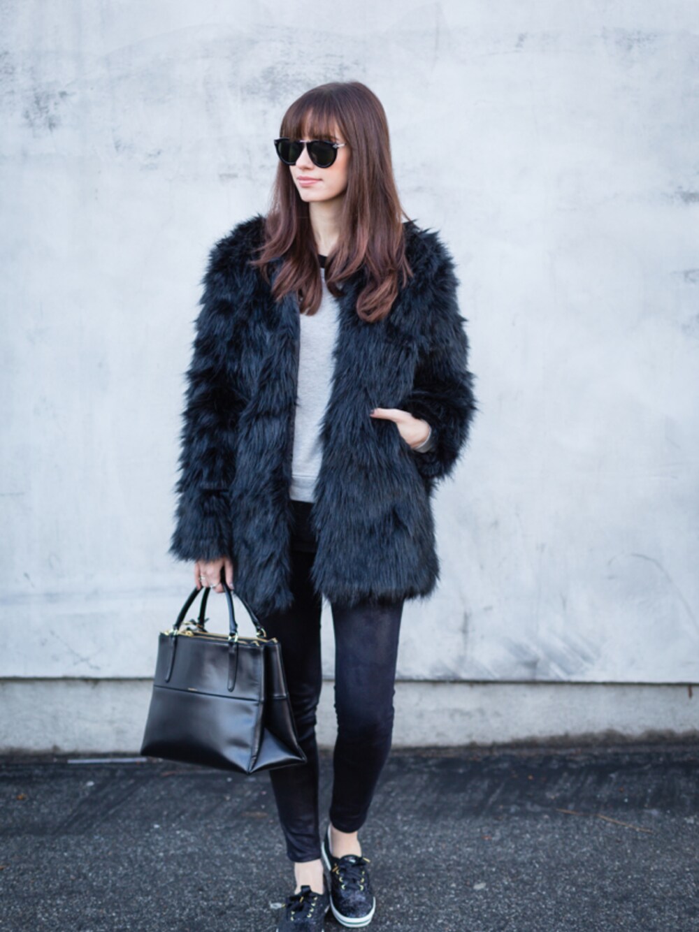 Wearing faux fur is a way to add an instant edge to your outfits, and it's very holiday appropriate, so I paired this black faux fur jacket with my jeans and sweatshirt outfit.