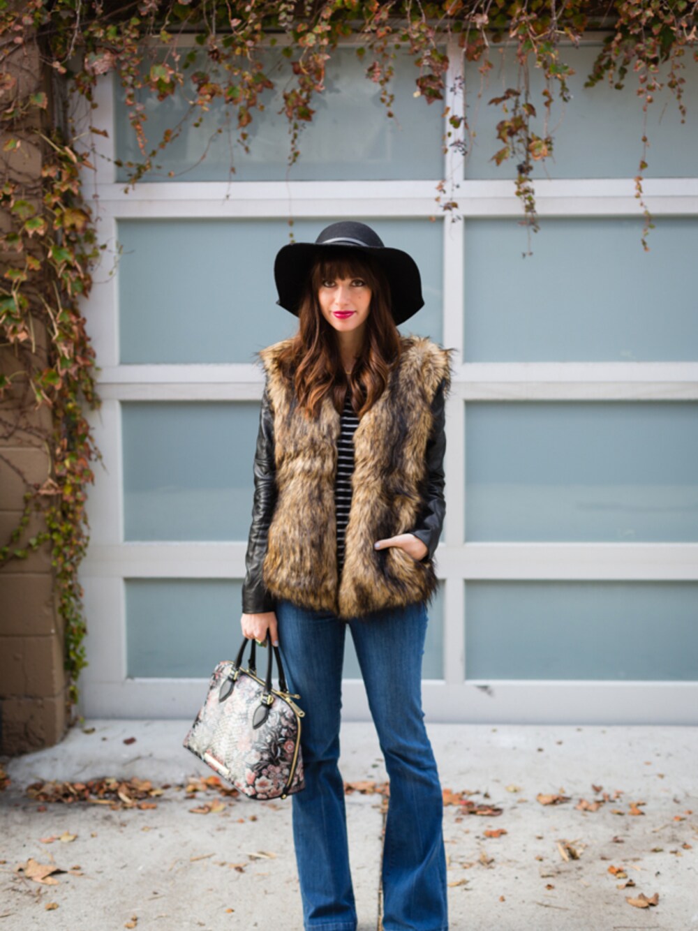 Wide leg jeans are super flattering and they bring a little 70's vibe to my outfits that I love. I paired these jeans with this longer striped tunic (so comfy), and this cool black-sleeved faux fur jacket. The jacket has a fun bohemian vibe and is perfect for these chilly days.