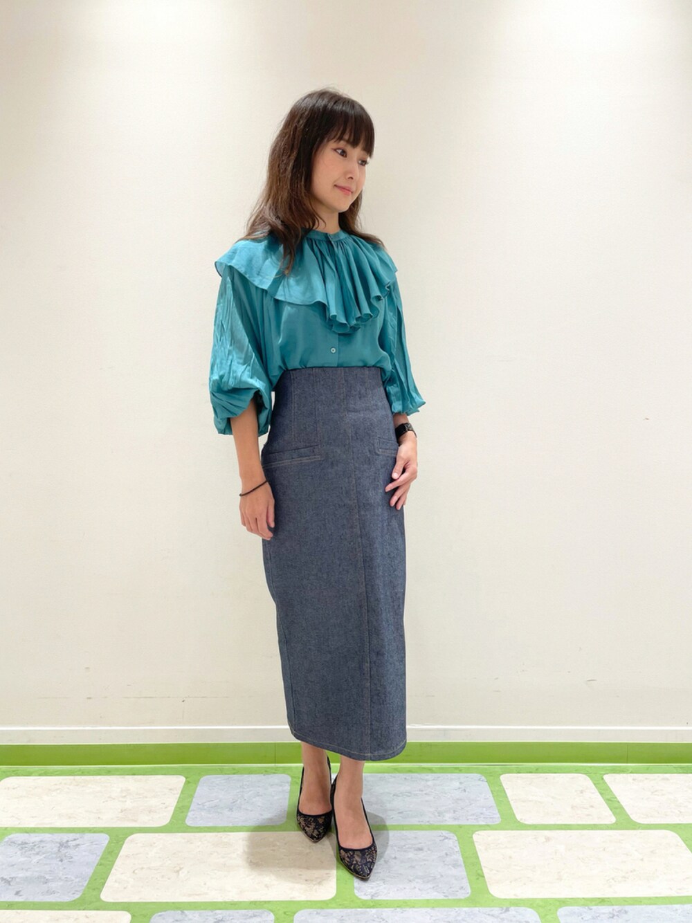 【tops】 今季トレンドのフリルカラーが 便利な2wayで登場。 ボリューム感がありながらも 程よいシアー感で重たく見えず ボタンを後ろにして着ることも◎ 【skirt】 ストレスフリーなストレッチ素材の デニムスカート。 細身のシルエットがお好きな方に おすすめです♪