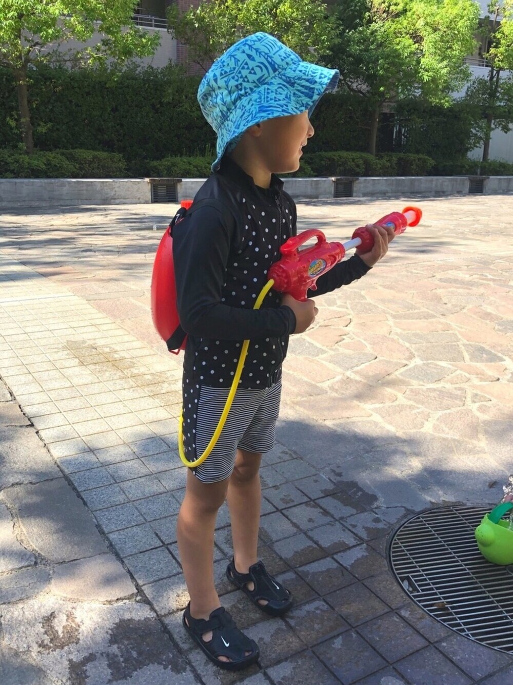 毎日水遊び🔫 走り回る時は走りやすい爪先ありのサンダルが安心👌 去年のだけどギリ履けました😁 帽子も去年のもので小さめ😂💦