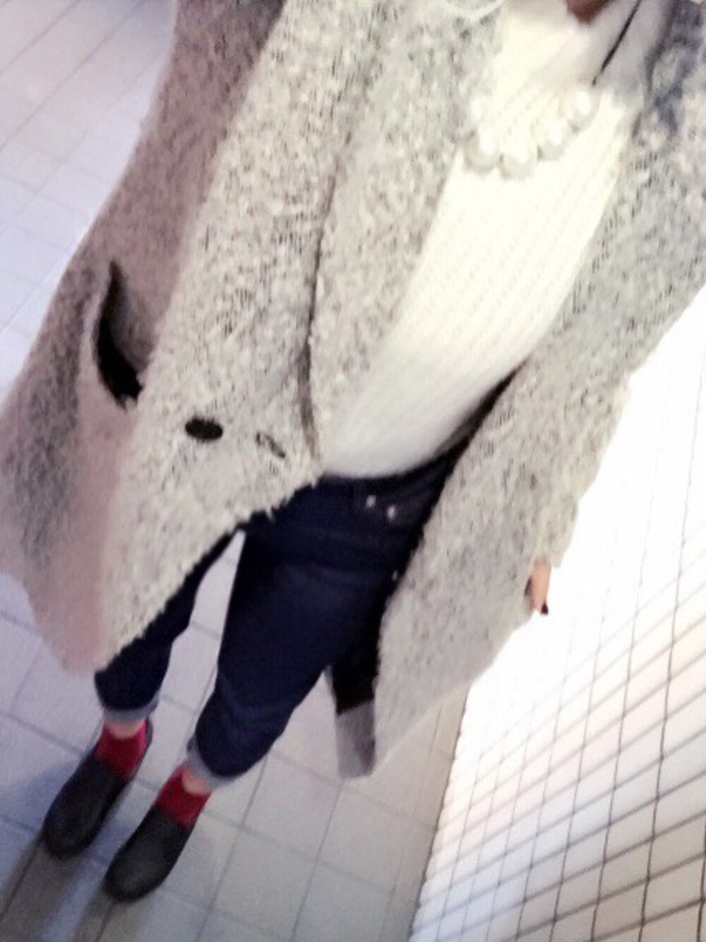 ホワイト系のニット/セーターを着用したレディースの冬コーディネートの1枚目の写真
