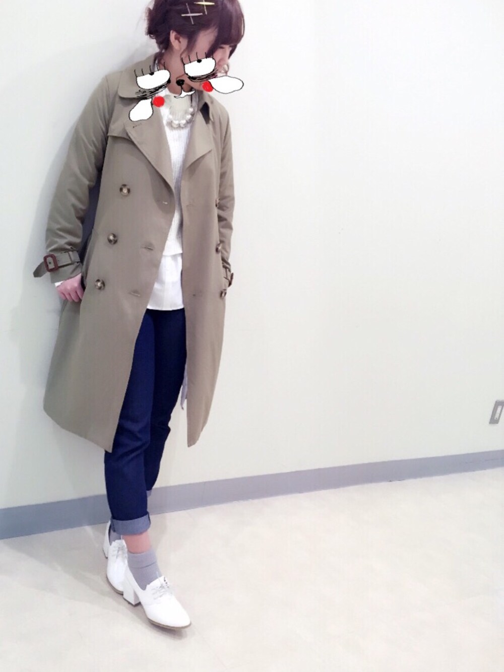 グリーン系のトレンチコートを着用したレディースの冬コーディネートの1枚目の写真
