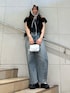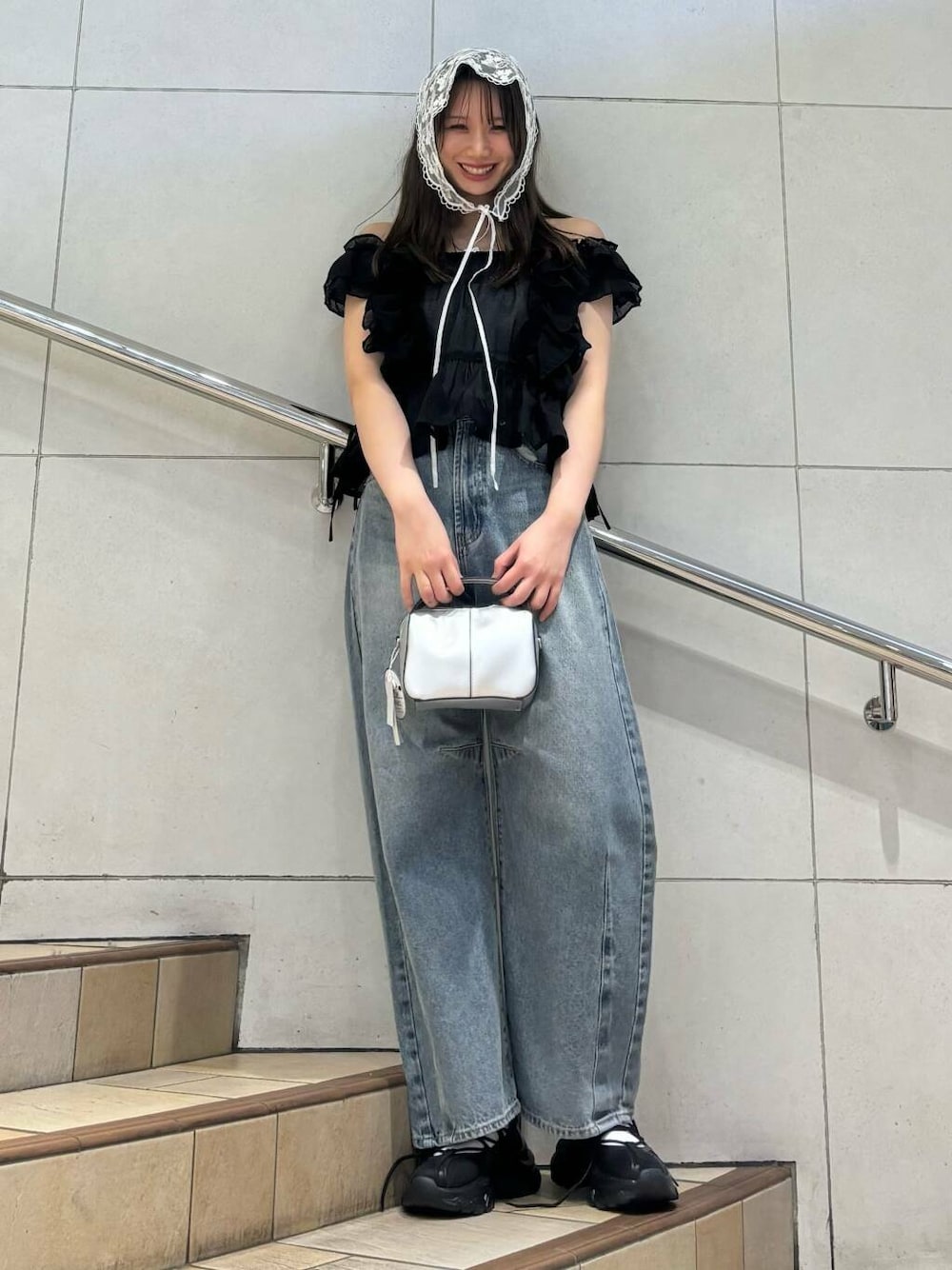 トップスはそのまま着ても、オフショルとしても使える優れものです! バブーシュカはレースになっており、カジュアルなコーデに合わせると甘くなりすぎずオススメ!!
