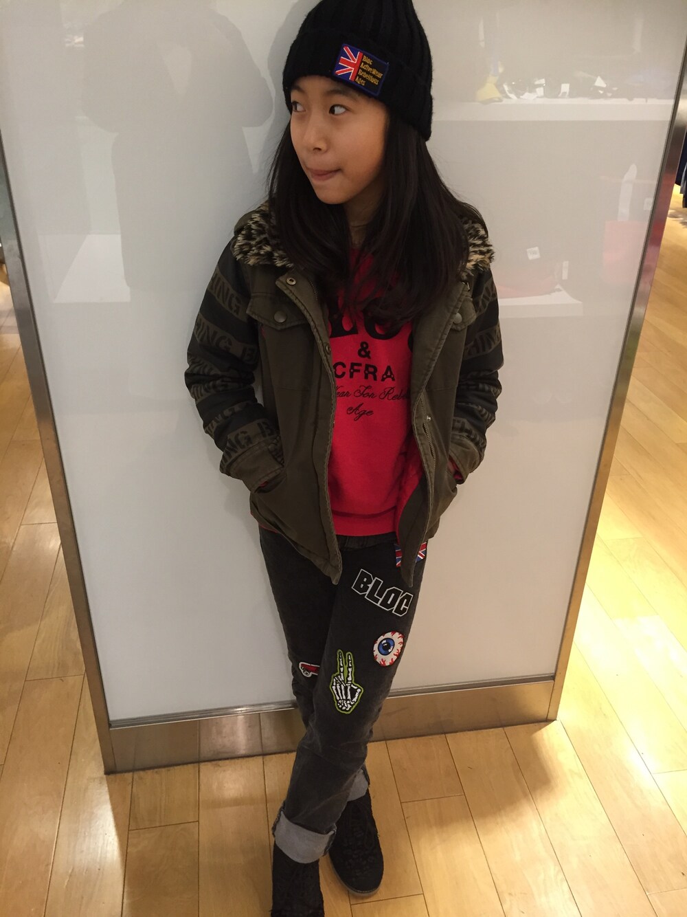 デニムパンツのワッペンとトレーナーのレッドを引き立たせるためにジャケットと小物を暗いトーンでまとめてみました♪