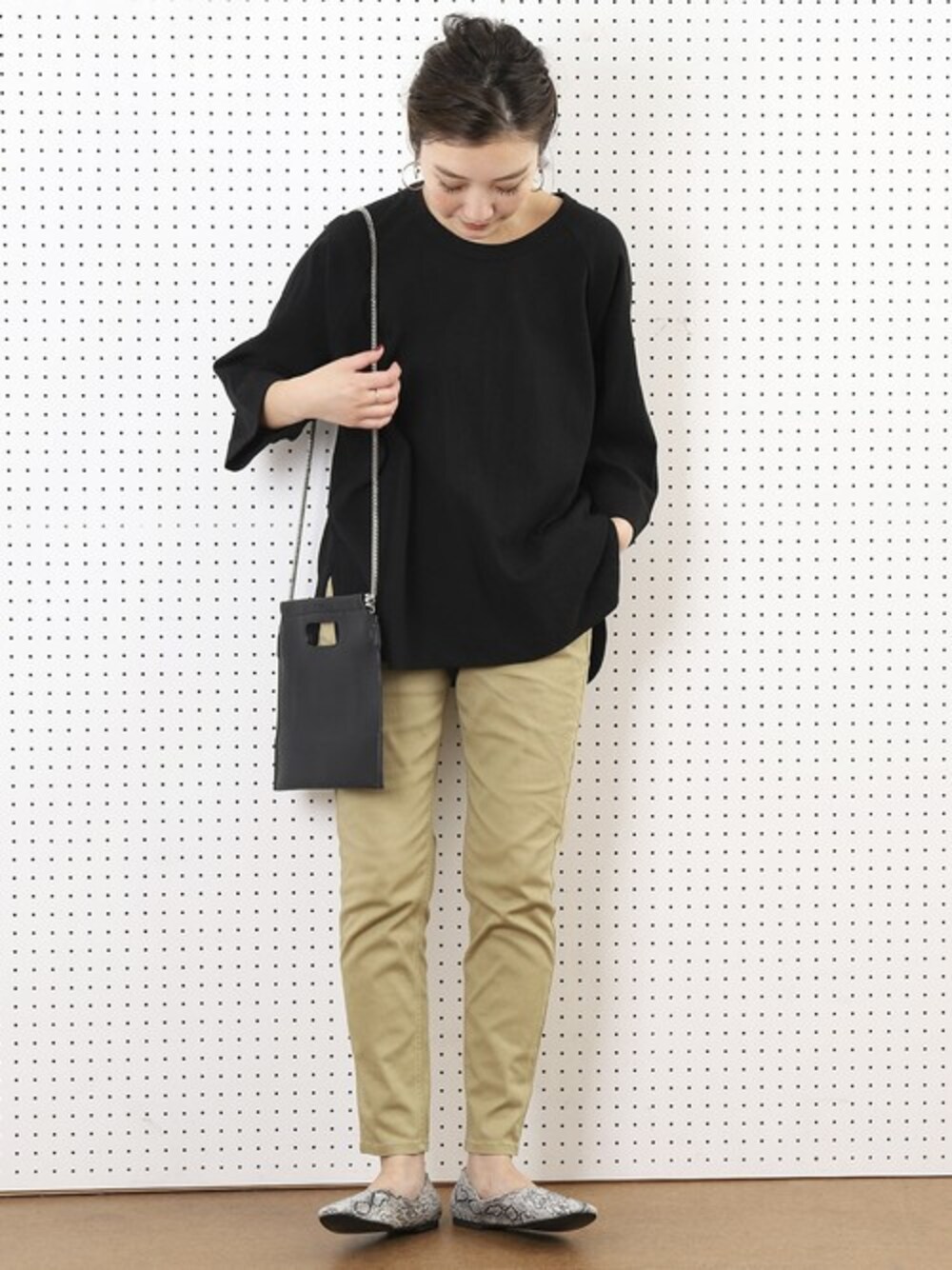 ベージュ×ブラックのシンプルカジュアルコーデ。