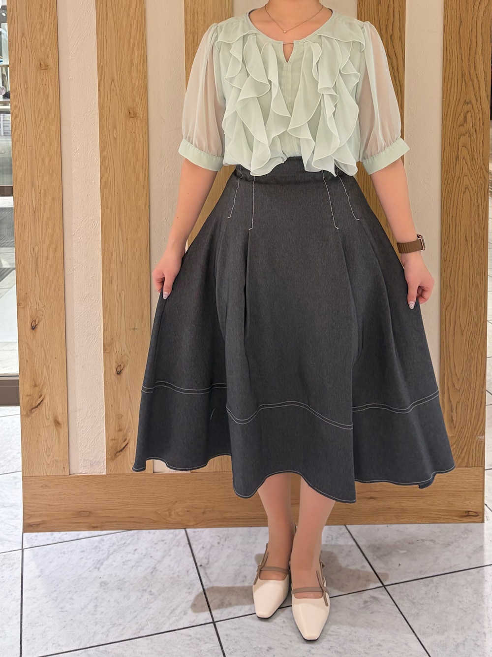 シアー感のあるフリルブラウス! 胸元にゴールドのバーがついてるのでアクセサリー要らず🙅♀️ スカートは、ミッシュマッシュで人気定番アイテム! 丈感が短めなので、低身長さんも履けます☺️👍🏻 身長→153㌢ サイズ→S