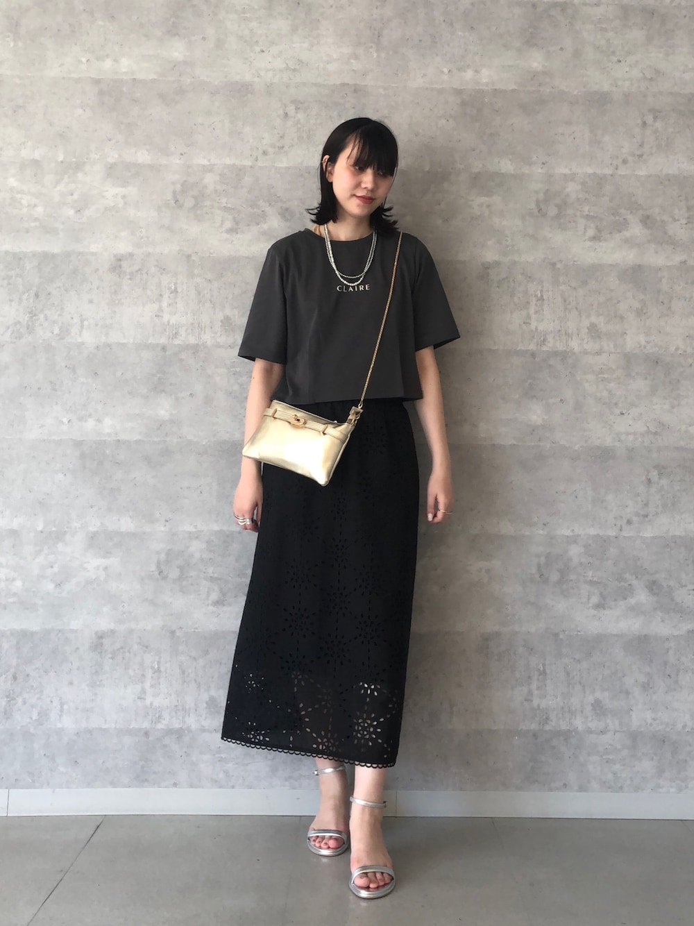 まだまだ暑い夏ですが、秋物も少し気になる季節にオススメのブラックコーデ! Tシャツ×レーススカートでカジュアル過ぎない大人カジュアルコーデに! ○Tシャツ ショート丈のロゴプリントT。 昨年も大好評だったシリーズです。 インせずそのまま着れるので小柄な方にもオススメ! 裾に少しタックが入っていて立体的なシルエットになっています。 5分袖なので秋にはジャケットインナーとしてもおすすめ◎ ○スカート トルコのレース素材を使用したスカート。 繊細なデザインがとにかくキレイでレース編みも大きすぎないので普段レースや甘めなテイストを着られない方にも着やすいデザインです! バックスリット入りなので足捌きも楽ちん! サンダル、バックはメタリックカラーでまとめて軽くしました。