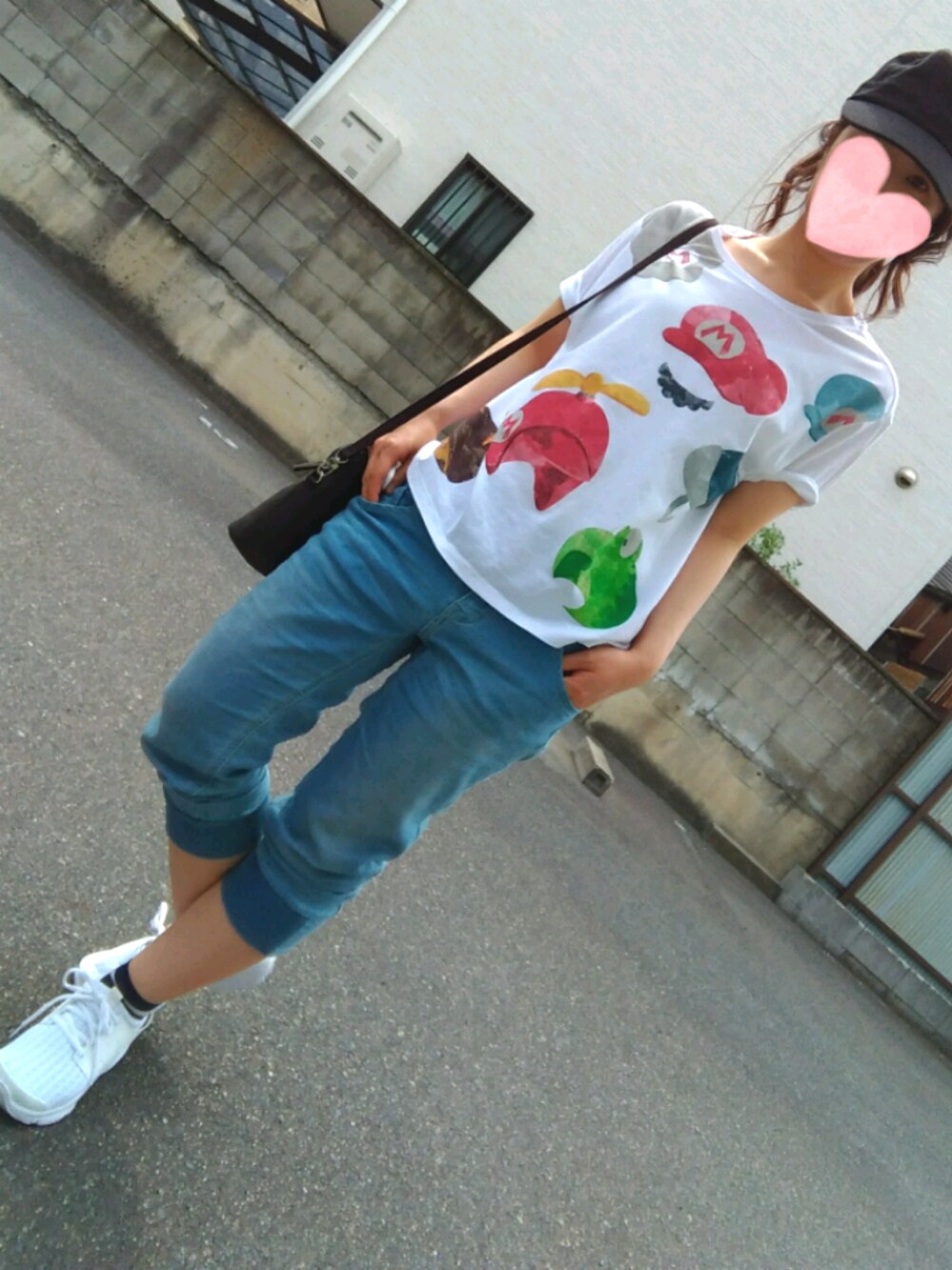 平日ですが休みでした😁 感謝祭で購入した任天堂コラボUT この柄が一番ピンときた! パンツはarmoire capriceのジョガーパンツ めちゃ楽チン! デニムに見えるけど、スエット生地😏 アンダーアーマーのスニーカー白も最終処分価格だったから買ってしまった。白スニーカー素敵❤❤