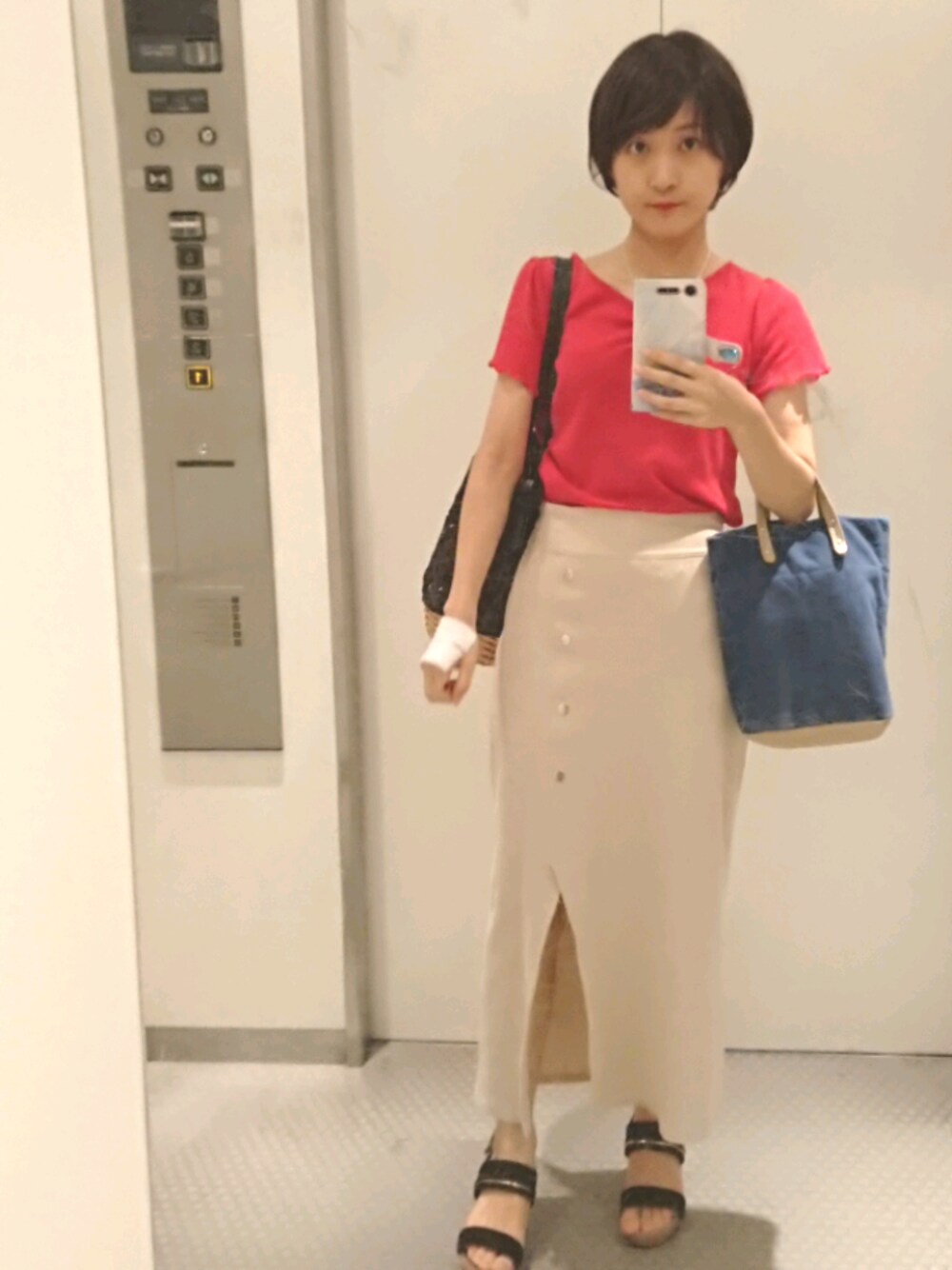 包帯携えながら美容室行ってきました。 新人の方にえ?めっちゃ腫れてますよ!病院行って下さい!!とご忠告頂きました。 ええまぁ、自分で手のツボ押ししようとしたら、手が固まってて、ん?ってなったから、 ほぐそうとちょっと押したらバキバキと音を立て激痛を伴った次第であります⚡ なんなんでしょうかこの状況…(・・?) コーデの方ですが、赤のトップスと珍しいリブタイトスカートを組み合わせると、案外いい化学反応が生まれました⚡️ 足元今日は熱かったのでせっかくやしと思いサンダル合わせに👡 靴屋さんに入ってショートブーツがあったので合わせてみたら、ヒールもありさらによくなった✨今度はそれで合わせてみよう😎💡