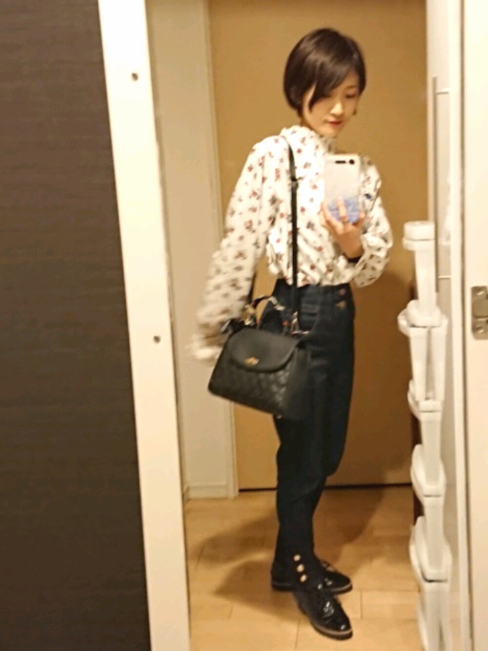 earth music&ecology系列店の薔薇柄🌹フリルトップスとデニムのワンツーコーデで出勤します💨