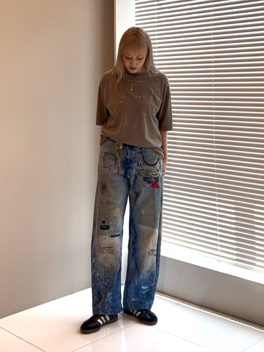 ご覧いただきありがとうございます♪ トップス▶Lサイズ着用 ヴィンテージライクスタッズTシャツ✨ 30リサイクルコットンを使用しているので肌触りも柔らかく着心地も軽い! 自然なヴィンテージ感を楽しめる一着です★ ピグメントダイ加工により、洗濯を重ねるごとにその色合いが深まり、まるで自分だけの一品のように育っていきます◎ ボトムス▶Lサイズ着用 グラフィティデニム・ 遊び心満載のトロンプイユデザインで、デコラティブなアクセサリーやダーメジ加工が特徴! 一枚で存在感が抜群になります! 立体的なプリントが施され、どんな角度から見ても魅力的です◎