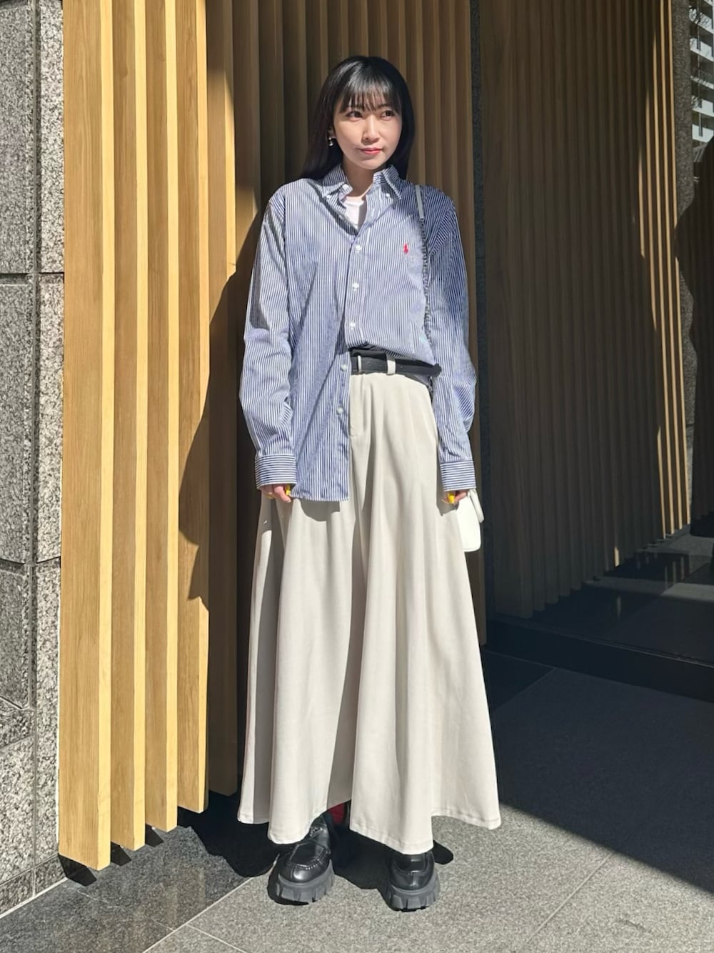 完全に春なのでシャツ一枚で👔◎ アイボリーのロングスカートが春カジュアル🌸!