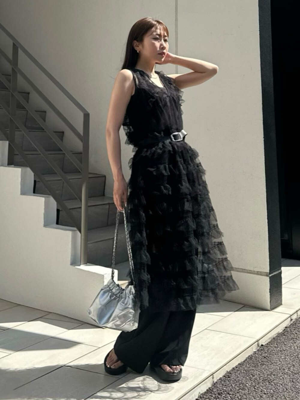 LIENCOEURのチュールOPを主役に オールブラックでも涼しいスタイリング🥷🏻✨ ベルトで締めて脚長効果も◎!
