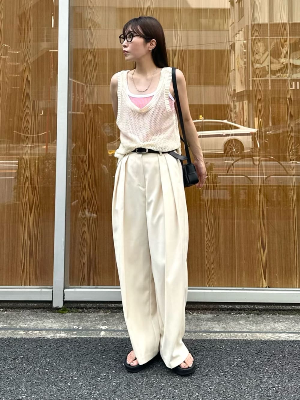 差し色で赤のタンクをレイヤード🟥 オールベージュでぼやけないよう、内容小物をブラックで締める◎! お気に入りのスタイリング✌🏻