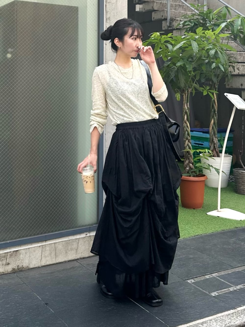骨格が綺麗に見える薄手のトップス(9月発売LIENCOEUR新作)に安定のリリースカート合わせ🪽 ホワイトはヘビロテ中だけどブラックもかわいい…🖤