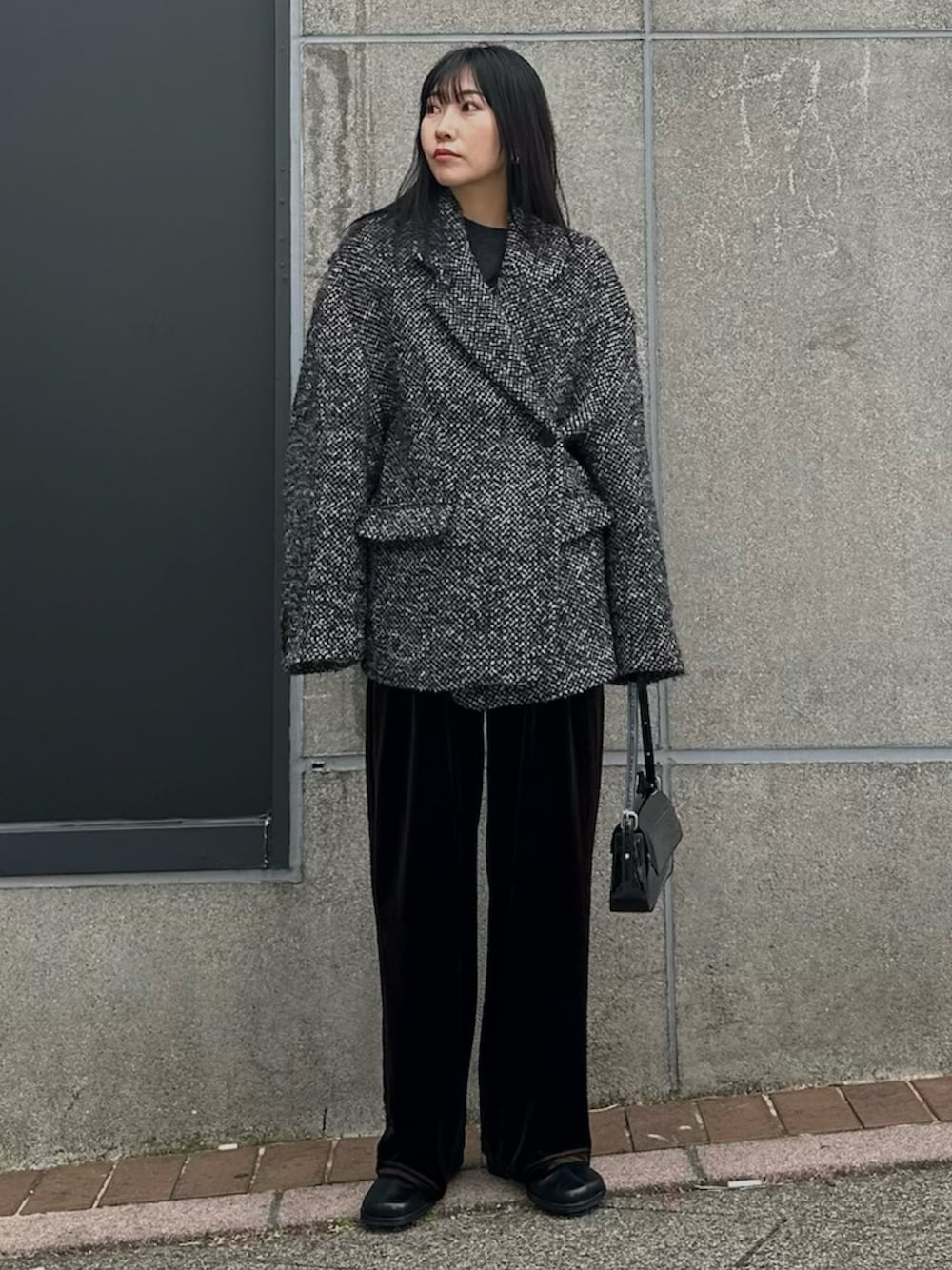 主張控えめのブラウンだと個人的には使いやすい🤎 全身ブラックにも飽きてきたので、ブラウンのベロアパンツで少し抜け感を◎!