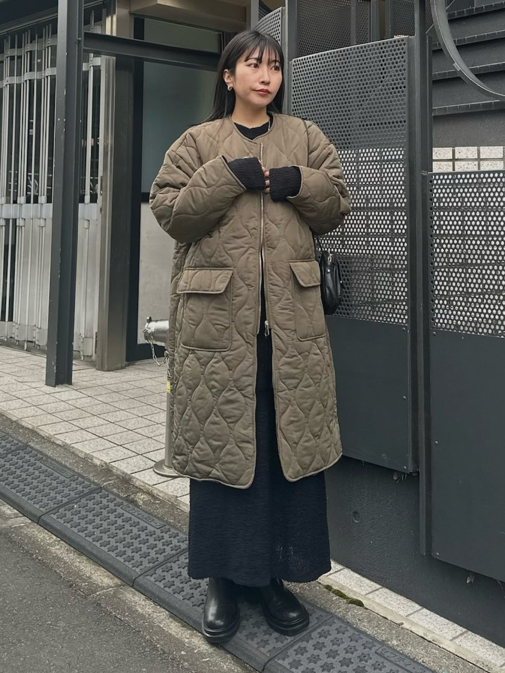 Mamiのダウンジャケット/コート「ノーカラーキルティングロングコート」を使ったコーディネート