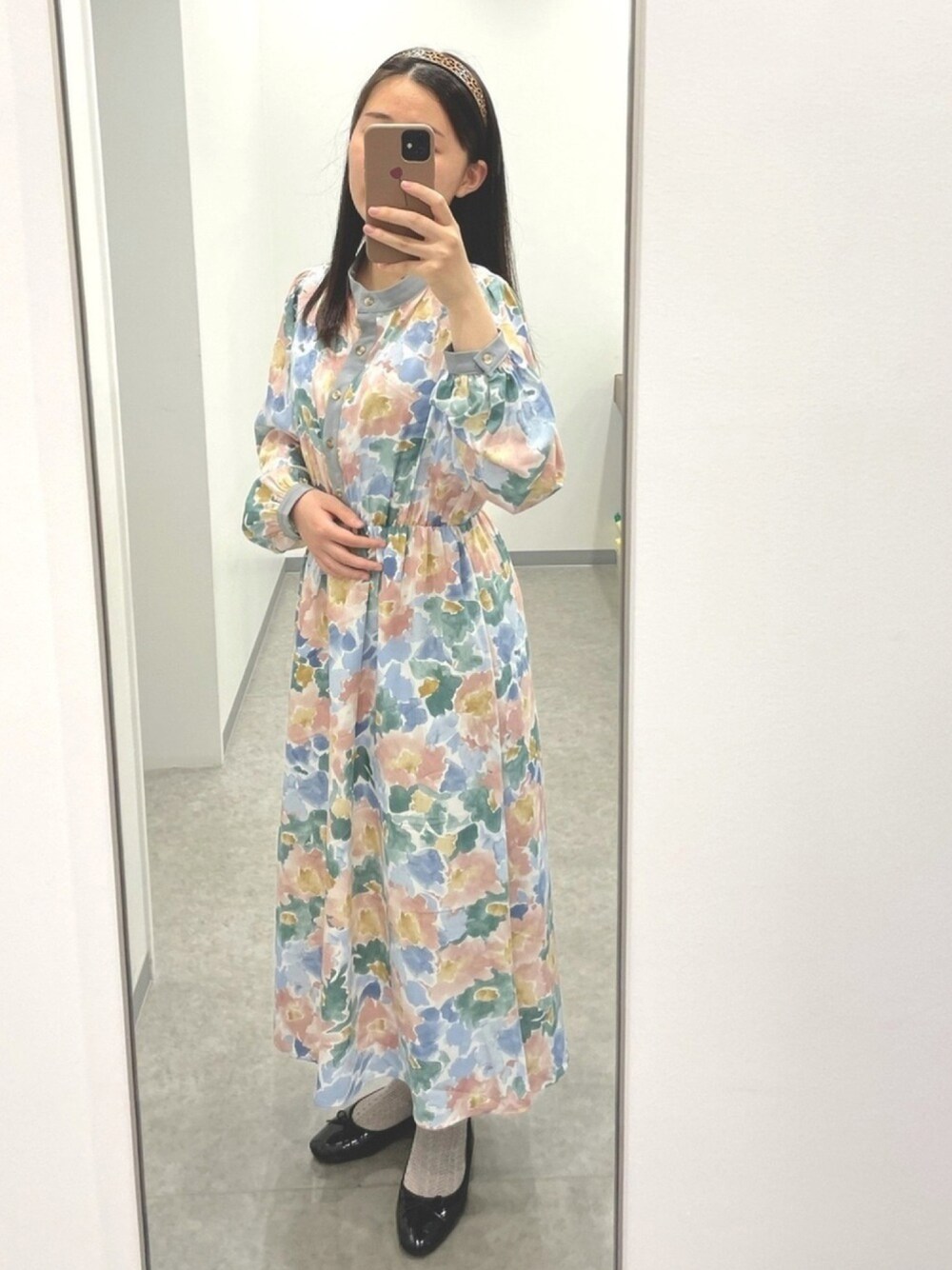 淡い水彩柄のワンピース♡ 梅雨入りしても、このワンピ着れば優しい気持ちになれる気がする🌱 バレエシューズは防水バッチリ😆 カチューシャは木目調で柔らかい印象に♪