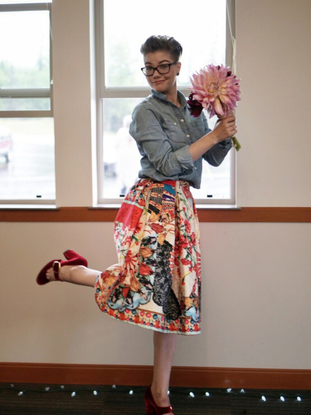 This is all about TEXTURE! I purchased the vintage skirt and vintage Italian velvet pumps at a local consignment store. Since both the vintage pieces are such a statement, I decided to keep it simple with a denim chambray shirt tucked in to the waist. Worn to a wedding as the photographer in mid-July.
